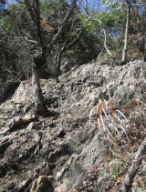 「石畳」は、展望の良い大きな岩が重なり合うようにあるところです。そこに洞窟があります。ここから右手の登山道を20mほど入ったところにも、もう一つ洞窟があります。ずっと奥が深くて、中でつながっていると聞いたことがあります。これは人工物なので、なんでこんなものがあるのか不思議でした。その謎はI氏に聞いて分かりました。マンガンを掘り出した跡だそうです。
