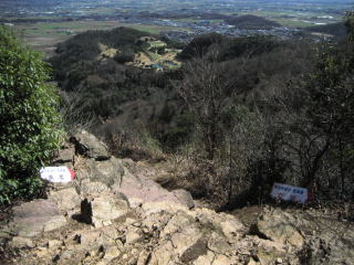 男坂は岩場の登山道ですが、危険なところはありません。展望も良いし夏の直射日光の当たるとき以外だったらお勧めです。女坂と合流すると、土止めのほどこされた段々を少し登ります。上がりきったところが、東屋のある展望台です。