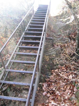 展望台から断崖上の大小山へは、左手に設置された鉄の階段を登ります。私はこの設置工事をしているときに来たことがありますが、なんでこんなもを付けるのかって思いました。でも、出来上がってみるとやっぱりラクチンですねぇ。写真では急で長そうにみえますが25段くらいです。上りきってから少し左に巻き、やまゆり学園方面との分岐を右に登ると大小山(282m)の頂上です。