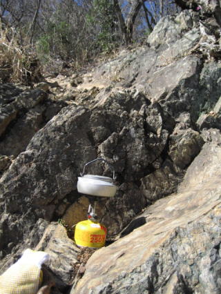 山頂は風が強かったので、南に下った日当たりの良い登山道で昼食にしました。1時22分です。もちろん、こんな日はインスタントの熱いラーメンとおにぎり。