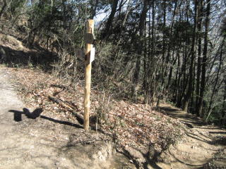 昼食休憩は20分。右手に大小山を眺めて少し下ると、赤見方面との分岐に出ます。ここを右手に行けば、「石畳」を経て神社の駐車場に降りて行きます。私は「西場富士」に向かうので真っ直ぐ行きます。