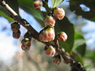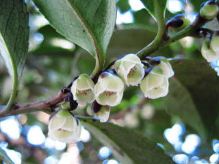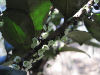 3月から4月頃、山道を歩いているとガスのような臭気が漂うのに気づきます。ヒサカキの花が咲いているのです。花は5ミリほどの小さな可愛いのが咲きます。図鑑では白花と書かれていますが、写真の左端のように赤が入っているのもあります。雌雄異株で中央が雄花、右端が雌花です。西場富士に入る尾根はヒサカキがとても多いところでした。