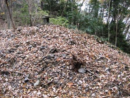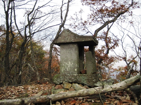 ここは、私達が『賽の河原』と呼んでいるところです。越床峠に出るには20分ほどの所でしょう。おそらくは昔の峠があった所で、東西に下りる道跡があります。写真では落ち葉に埋もれて見えませんが、全体が片手で持てるほどの小石ばかりが堆積した丸い小山になっていて、上部に石祠が置かれています。木々の茂る頃に訪れると、かなり薄暗くて、不思議と草も木も全く生えていない石ばかりの場所です。こんな所は縦走路中にここだけです。