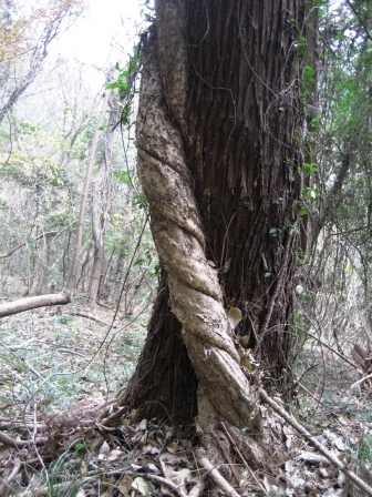 道跡は微かですが確かにあります。私の推理では、この山道こそがかつての越床峠道だったのではないか、と思うのですが本当のところはどうでしょうね。山藤のジャングル地帯がありました。右の写真は別の個体ですが、右側の写真の藤蔓は径20cmはあろうかと思われる見事なものでした。こんなのに巻きつけられる木はたまったものではないでしょうね。