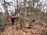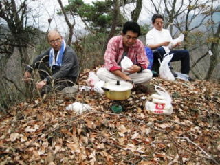 ここで迷わずに尾根に乗れば、あとは三床山まで心配な箇所はないですよ。しばらくは落ち葉を踏んでのランラン気分が続きます。次の大きなピークが「天ヶ岳」。私達はここで昼食の予定。先行隊が今日のメーンイベントであるウドンの支度をしているはずで〜す♪