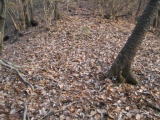 さて、縦走して北の金原山から来るときに、最も間違いやすいピークが左の写真。ここは道なりにまっすぐ行くと、直ぐに北北東の広い支尾根となり、「手のひら尾根」を越え大久保の集落方面に出てしまう。南に入って下らなければならないのだが、道跡のはっきりしたまま行くと、梅園の最奥の集落、西根の方に下ってしまう。コツはピークから5mほど下にある白テープで左に入り、急な斜面を立木にひっつかまりながら、南南東に延びる尾根にうまく入ることだ。