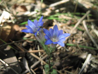 ヤマツツジの他に出会うのを期待していたのがこのフデリンドウです。リンドウ科の花で春に咲くのはコレとハルリンドウで良く似ています。10センチに満たない位の背丈ですが、ブルーの色がなんとも美しいです。毎年咲く場所を知っていますが、今回はそこになくどうしたのかと思っていたら、日溜りに小さな群生をつくっているのを見つけホッとしました。