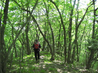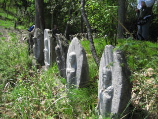 六地蔵峠到着10:18。秋の日溜りハイクの頃も良い所ですが、新緑も雰囲気がいいですね。今回は巻尺で六地蔵の大きさを計ってみました。台座を含めて高さ70センチ幅30センチです。たぶん里人が背負って上げたのでしょうね。そのとき、彼らは何を祈ったのでしょう。今はごく限られたハイカーにだけしかその存在を知りません。この三床山塊には他にも興味深い遺跡があります。鏡岩と庚申塔群はそのひとつですが、人里離れた山中に30を数える庚申塔を設置した理由は、里人も老人でさえその存在を知らず、今となっては全く不明です。いつか、それを紹介できる機会があればと思っています。