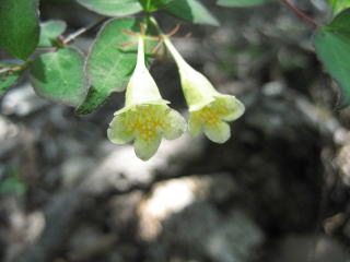 右の写真はツクバネウツギ(スイカズラ科)です。一ヶ所から2つラッパのような花が咲いています。ガク片が5枚開いて付いてますが、これが果実になったときも残り、羽根突きの羽のように見えるところから付けられた名前だそうです。