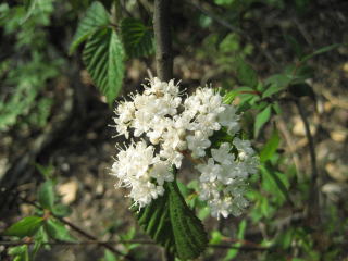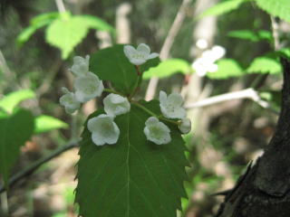 右の写真の花はガマズミ(スイカズラ科)だと思います。小さな木で葉っぱもふつう見るより小さく、実がなってみないとよく分かりません。花もコレだけでした。黄色い実がなるキミノガマズミというのがあり、桐生の吾妻山で小さい木に実がなっているのを見たことがあります。もっとも、このときは葉っぱが落ちてしまっていて確信が持てませんでした。どっちにしろ分かんないって事ね(^_^;) (他候補にコバノガマズミ・ミヤマガマズミ)