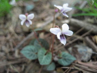 スミレは種類が多くて私にはとうてい手に負えません。でも、せめて山で見られるくらいはと思っています。そこで、分かりやすいのは左の写真の「フモトスミレ」です。葉っぱの形や白い花が特徴かなぁ。杉林の半日陰のようなところによく咲いています。右の写真は○○スミレと○○の付かない「スミレ」です。これは日の当たる大きな岩の狭い棚のようなところに咲いていました。風に揺れていたのでちょいピンボケですね。芭蕉の句に『山路来てなにやらゆかしすみれ草』とあるのはこの「スミレ」でしょうか。