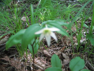 チゴユリ(ユリ科)が咲き始めていた。残念ながらピンボケ。コレ1枚しか撮ってないのでしょうがないから雰囲気だけでも見てくださいね。ふつうはこのように1輪だけですが、2輪ついて咲いているのもあります。