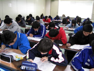 新中学3年生に受験の心構えを持ってもらうために、模試を実施。 |