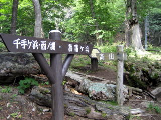 ここを高山方面に行けば、無名峠を越えて低公害車バスの通る幕張峠へ出る。以前、高山から小田代原を歩いたとき、唐松や白樺の林が続くユッタリした峠道を思い出した。