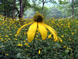 山裾を回りこんで降りたところに、ハンゴンソウの群落があった。花は終わりかけているのが少し残念。その中をぬけると、いきなり舗装された車道に出た。そこを右に下がっていけば菖蒲ヶ浜に出られるのだろう。しかし、ほっとしたせいかけっこう足が重い。ここは左に上がり、竜頭の滝停留所に向かうことにした。