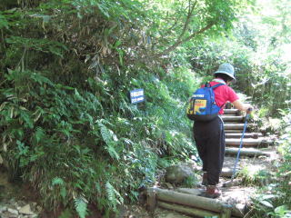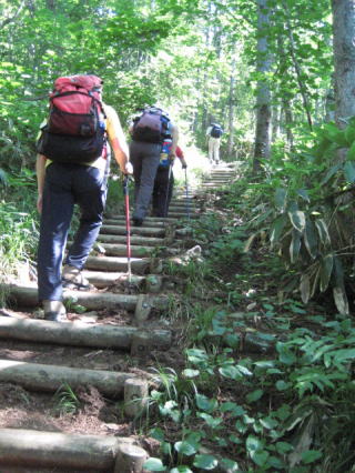 平元新道は良く整備された階段道が続きます。唐松林や広葉樹の樹林帯なので展望はほとんどありません。