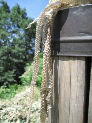 山の家前の標柱にヘビの抜け殻が・・これわざと飾ってあるんだよ。あんましイイ趣味とはいえないよねぇ。と言いながら撮るヤツもいるしぃ^^;