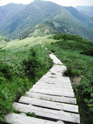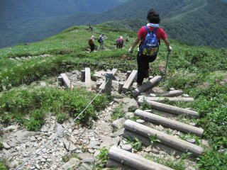 山頂から麓の元橋の駐車場までは、標高差が千mあります。ですから、下の写真のようなガレた場所の階段道もあります。下山にこのコースを選択したのは全く正解でした。こちらを登りに使っていたら花を楽しむ余裕はなかったかも知れませんね。