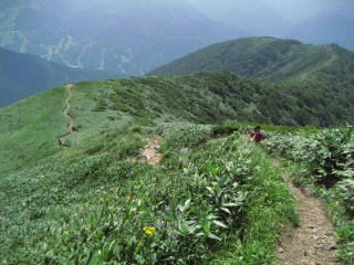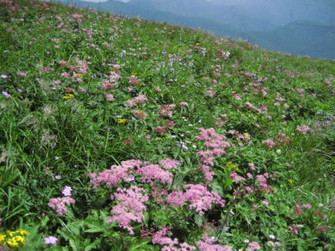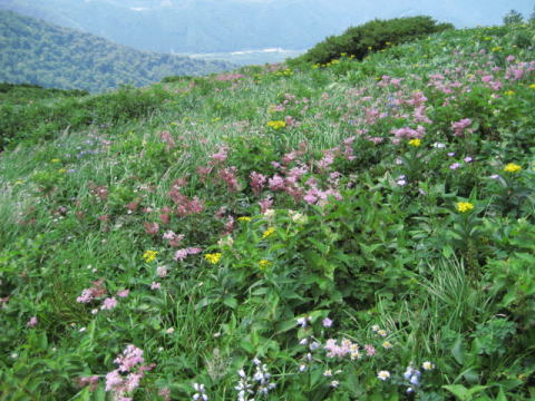 両サイドがお花畑です。高原のようなところの登山道では、思わず休憩代わりに立ち止まってしまいます。
