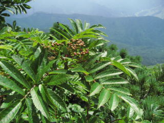 登山道の脇に、小さな赤い実が目立ます。これは「アカモノ」の実です。花は鈴型の可憐な白い花です。この名前は「あかもも」に由来するそうです。もちろん食べてみました。まだ、熟してないからでしょうか、味はいまいちでしたぁ^^;