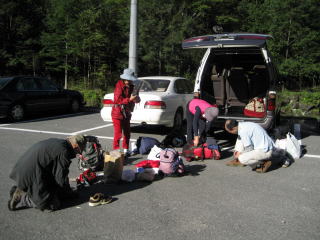 駐車場の湖寄りはほぼ満杯ですが、泊り客だけでなく釣り客も多いようです。私たちは一番奥に停め準備をします。私だけは最初から登山靴を履いてきたので支度は簡単です。