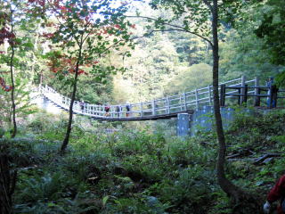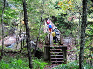 今日、湯沢越えしてきたのは私たちの他にいたかどうか分かりませんが、展望台には何人もハイカーがいました。ここから鬼怒川本流にはジグザグに急降下します。すぐに吊り橋に出ます。