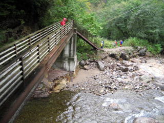 最後の吊り橋を渡ると、いったん河原に下ろされてしまいます。新しい遊歩道を工事中です。河原から林道に上がるのはすっと平坦だったのでキツイです。